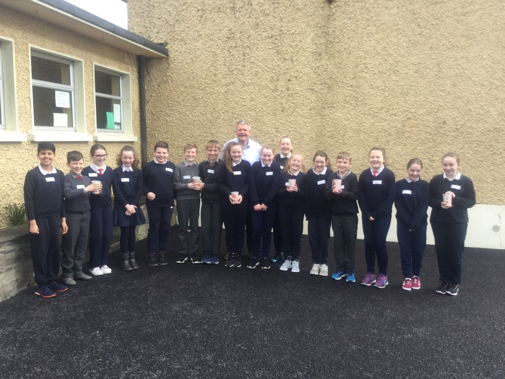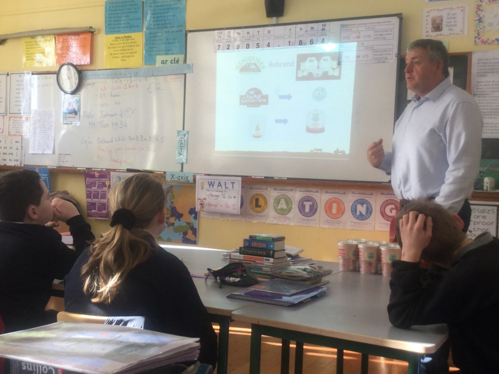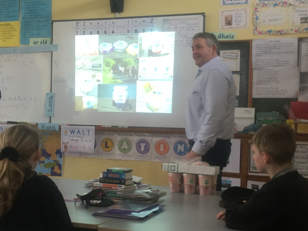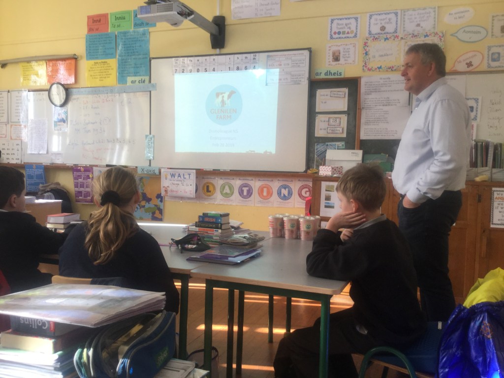 In February, we had a visit from Alan Kingston from Glenilen Farm who gave a very interesting talk about his entrepreneurial experiences and he gave 5th class lots of advice on how to proceed with the project. He also brought us some delicious yogurt to enjoy.