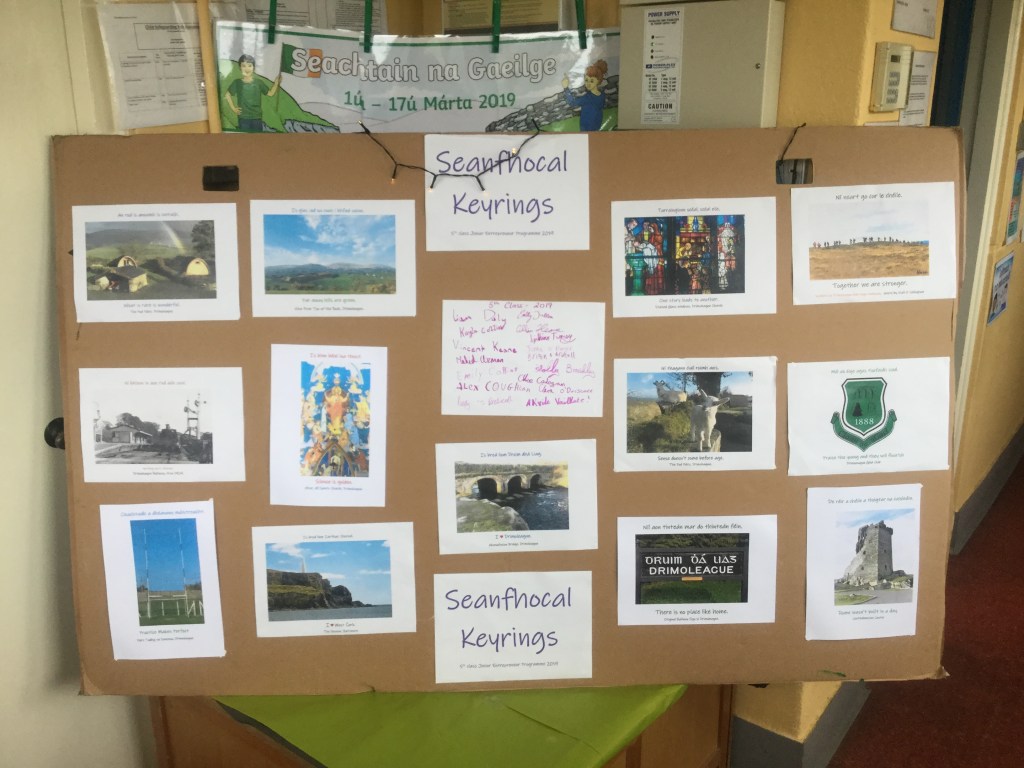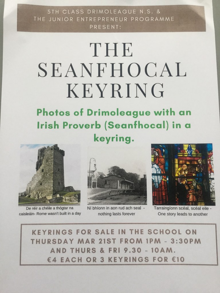 The Dragons praised all presenters and decided that the class should move forward with the Seanfhocal Keyrings. The Seanfhocal Keyring design included a photograph or drawing of some aspect of Drimoleague on one side and a suitable Irish proverb or seanfhocal on the other side.