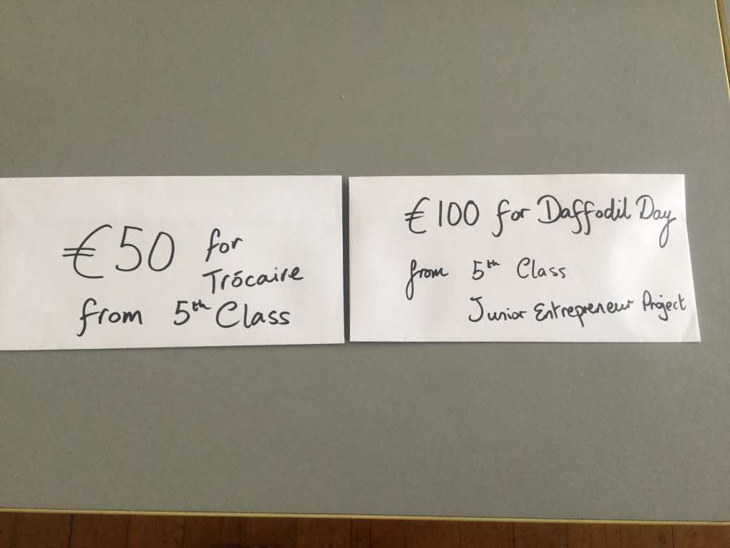 Summary: The project raised €690, the costs were €222 . Total profit was €468. €150 was donated to Daffodil Day and to Trócaire. The remaining profit is €318 . This will be spent on school resources and a treat for hardworking 5th Class.