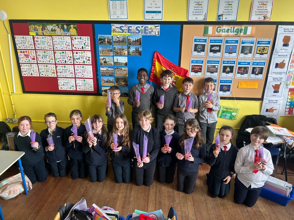 During ‘Wellbeing Week’ the children planted sweet pea seeds and got to take them home as gifts for their moms on ‘Mothers Day. A special thanks to our SNA Noreen for helping the children plant their seeds.